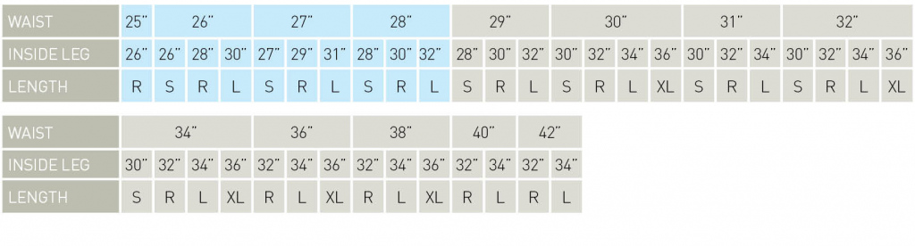 Inside Leg Length options: Short (S), Regular (Reg), Long (L) and Extra Long (XL) Inside Leg Length sizes