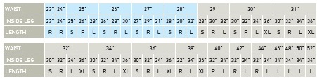 Waist sizes: 23″, 24″, 25″, 26″, 27″, 28″, 29″, 30″, 31″. 32″, 34″, 36″, 38″, 40″, 42″, 44″ in a choice of Short (S), Regular (Reg), Long (L) and Extra Long (XL) Inside Leg Length sizes