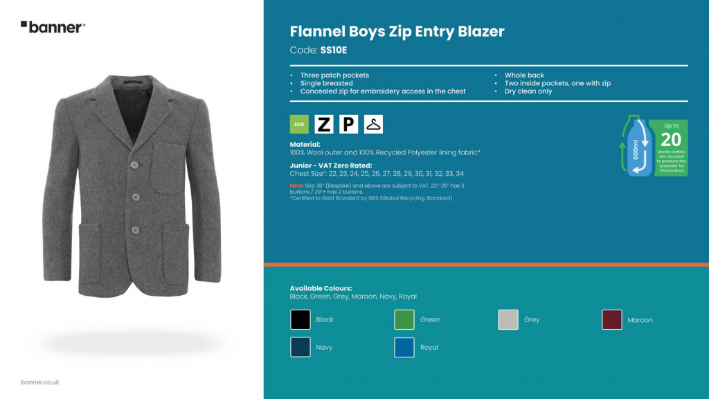 The school uniform flannel blazer for boys is made from 100% wool, its unique properties make it as appropriate for the summer as it is for the winter.  The flannel blazer is a smart addition to any smart, prep or pre-prep school uniform. It is available to purchase blank, or can be embellished with school crest and trim colours, minimums apply.