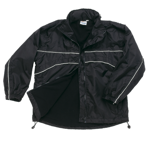 Sports training rain jacket with waterproof ripstop nylon outer, concealed hood in collar and warm fleece lining . Sports design with white piping, full zip opening, elasticated cuffs and phone pocket. Junior sizes have open hem, whereas senior sizes feature an elasticated draw cord hem with toggles.