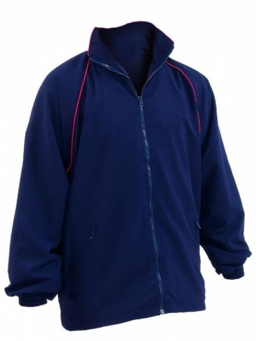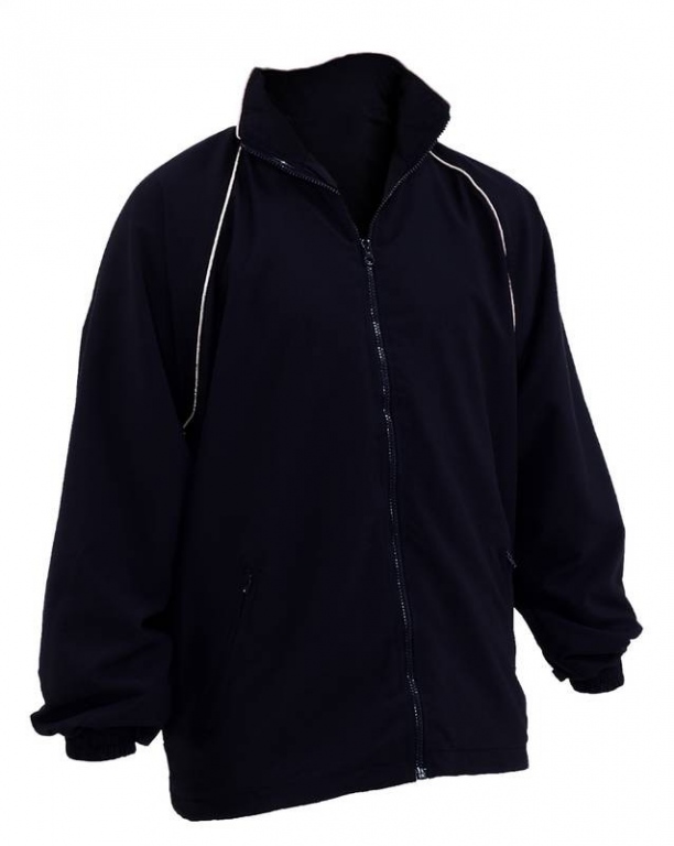 Sports training top jacket with 100% microfibre polyester outer and sports mesh lining, turning to nylon at sleeves. Sports design with contrast piping, full zip front fastening, elasticated draw cord and toggle at waist on senior sizes. 2 zip pockets.