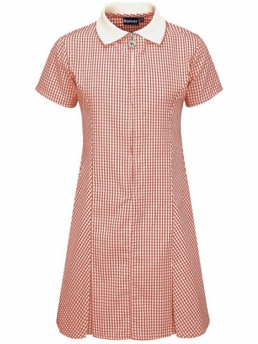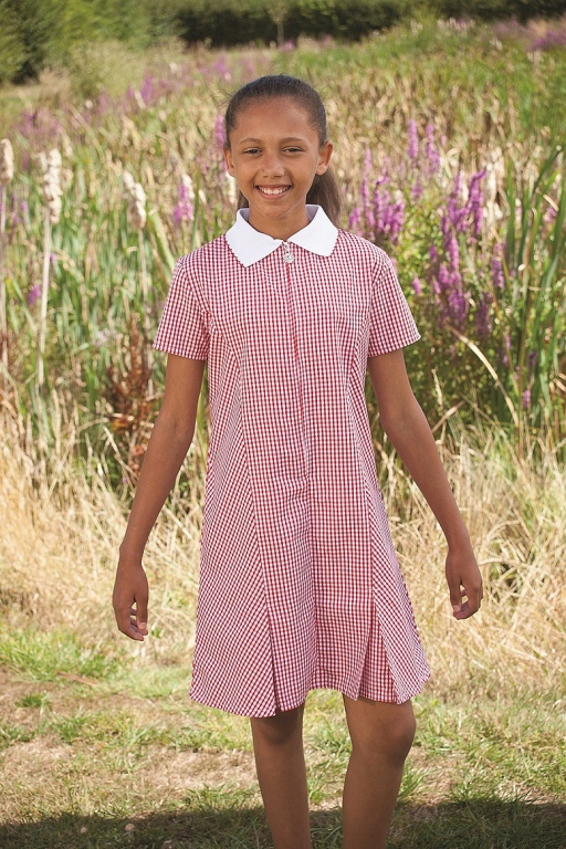 This pretty school summer dress is made from a polyester cotton mix corded fabric, and has a stylish design to include a zip front, knitted collar and bias cut side panels. A cool gingham dress for the warmer summer months.