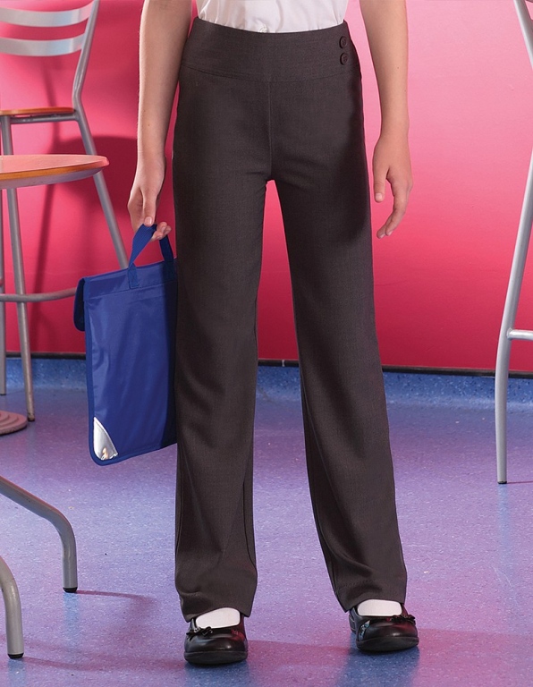 Junior pull-on trousers in an easy care stretch polyester / viscose fabric. These stylish girls school trousers have a deep waistband with 2 decorative buttons and a half elasticated waist at the back for ease of dressing. Long length options available on the age 9/10, 11/12 and age 13 sizes.