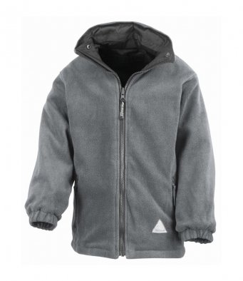 Black waterproof coat with reversible grey fleece jacket embroidered on the black waterproof outer shell with the Hob Green Primary School logo.