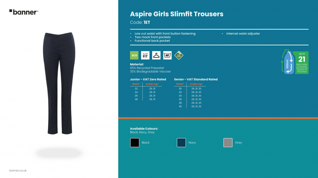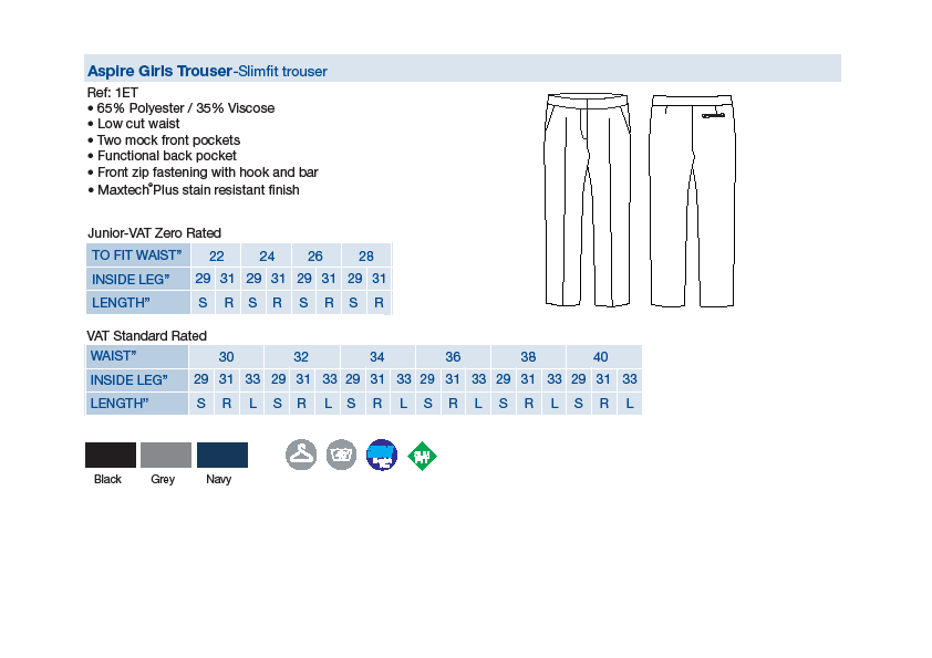 Stylishly designed and tailored for comfort and practicality with low cut waist and front zip, hook and bar fastening.
