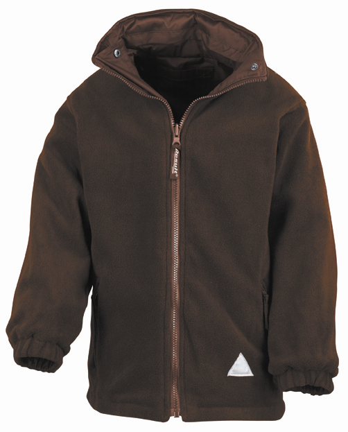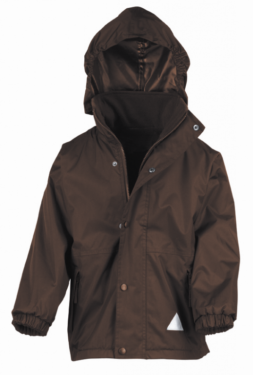 Features include a fold away hood concealed within the collar, a stud closing storm flap, elasticated cuffs, 2 external pockets on both sides, one pocket containing label with space for name / class and 3M reflective triangles applied to both sides on the junior sizes.