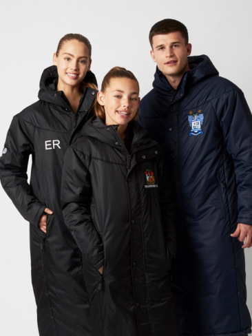 A quality team wear bench coat available in a range of Youth and Adult sizes and two colour ways, navy and black. Water repellant full length coat with thermal wadding for extra warmth. Stylishly designed with full zip opening, concealed press studs, storm flap, two deep pockets, hood and power stretch cuffs.