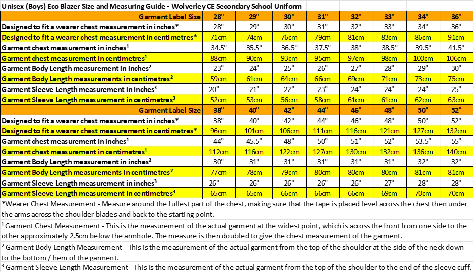 Unisex (Boys) Eco Blazer Sizes and Measurements